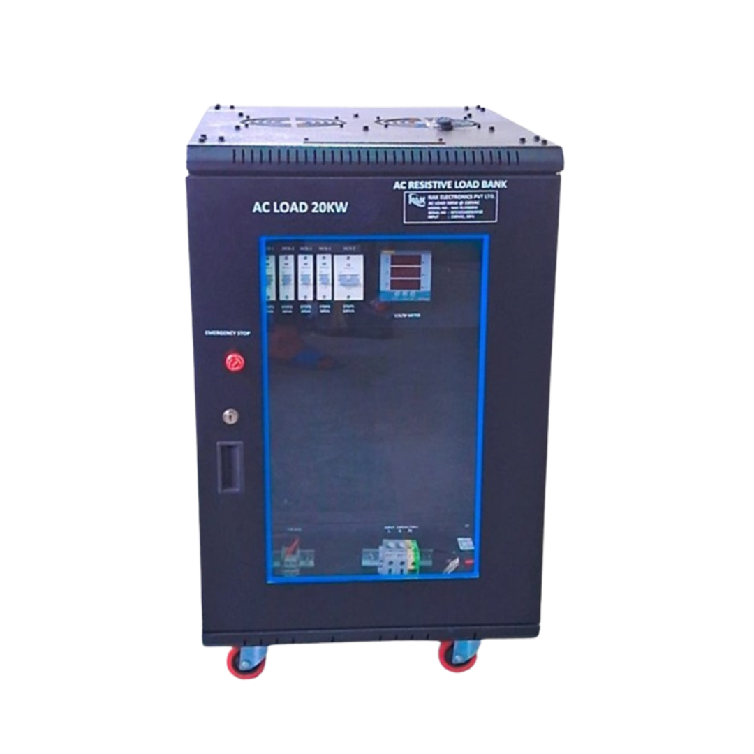 The NAK-RL20000W is a high-performance AC resistive load bank designed for efficient testing with a capacity of 20KW at 230V. Featuring five adjustable load steps and a digital display for monitoring, it ensures precise power control with a power factor of 1.0. Built for safety and mobility, this load bank is ideal for indoor use, equipped with an emergency stop switch and forced-air cooling. Made in India, it combines durability and efficiency for all your load testing needs.